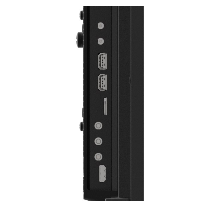 La pantalla cuenta con WiFi, múltiples puertos HDMI, USB, Ethernet, y DisplayPort, ofreciendo una conectividad extensa y flexible.