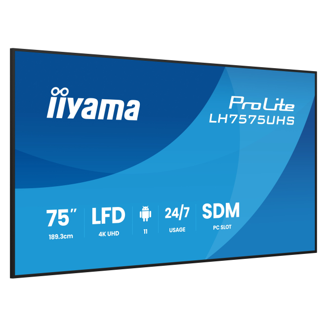 iiyama LH7575UHS-B2AG Pantalla de señalización plana de 75 pulgadas, 4K Ultra HD, LCD, Wifi, 500 cd/m², color negro, con procesador incorporado y Android 11.