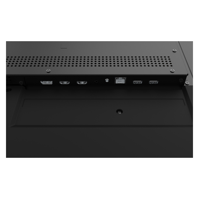 La pantalla ofrece conectividad avanzada con 2 puertos HDMI, múltiples puertos USB, un puerto Ethernet LAN (RJ-45) y WiFi integrado, entre otros.