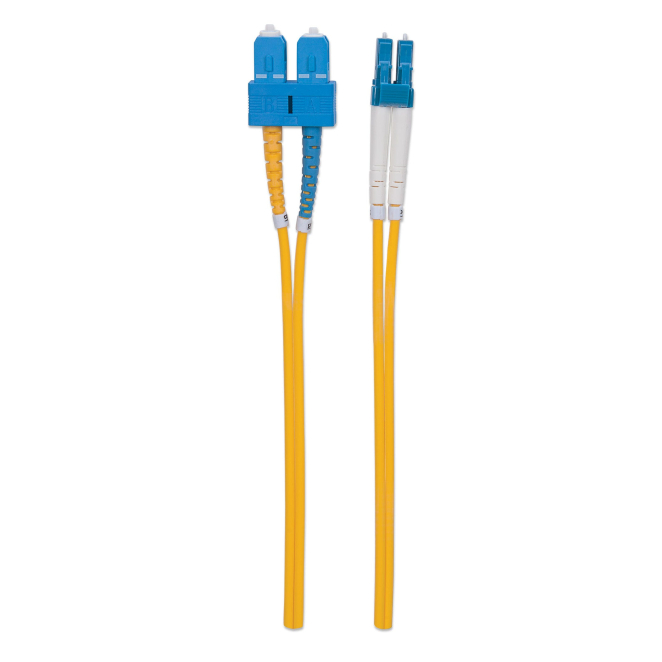 Imagen del cable de fibra óptica Intellinet, 2 metros de largo con conectores LC y SC en color amarillo. SKU 473972.
