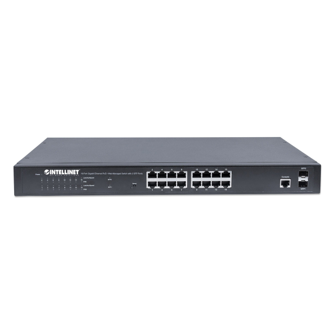 Intellinet switch gestionado modelo 561198, L2+, Gigabit Ethernet (10/100/1000), con función de Power over Ethernet (PoE) en una unidad 1U de color negro