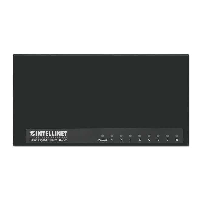 Vista frontal del switch Gigabit Ethernet Intellinet de 10/100/1000 mbps, color negro, SKU 561754