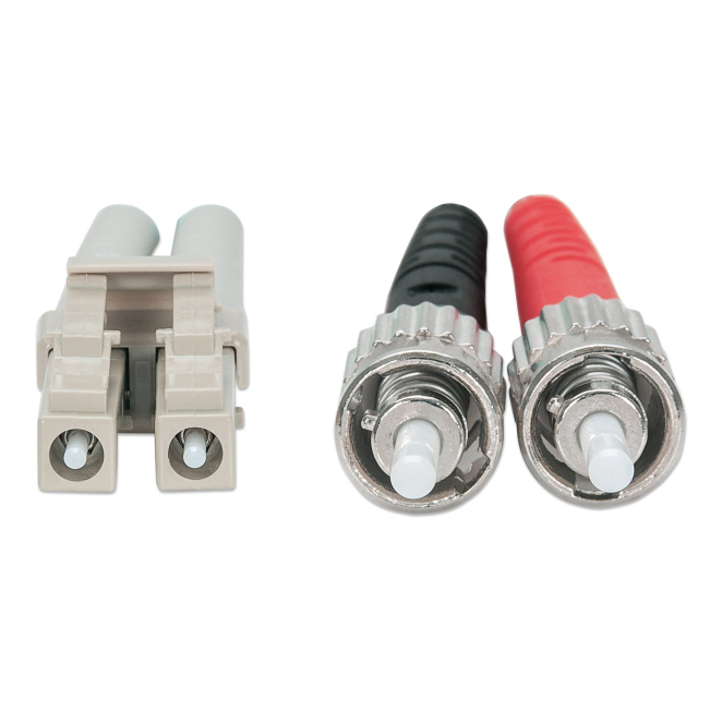 El cable está equipado con conectores ST y LC, ambos de tipo macho.