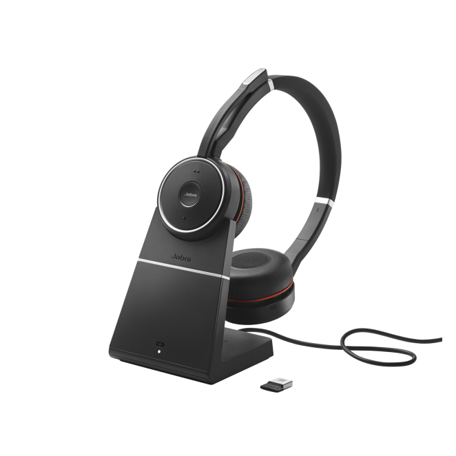 Jabra Evolve 75 SE auriculares inalámbricos y alámbricos de diadema, ideales para llamadas y música, con Bluetooth y base de carga. SKU: 7599-848-199