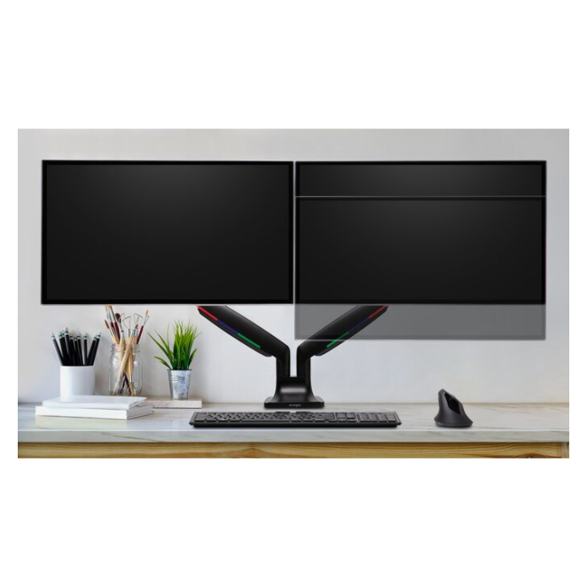El Kensington brazo doble de monitor cuenta con un ajuste de altura manual, lo que permite personalizar la altura según sus necesidades de ergonomía.