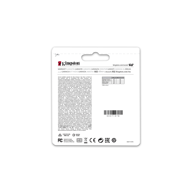 Aquí están algunas de las preguntas más frecuentes acerca del Kingston Technology DataTraveler 64GB Micro USB 3.2 Gen 1. Sí, este dispositivo es compatible con Windows 11, así como con otras versiones de Windows, macOS, Linux, y Chrome OS. Esta unidad utiliza una interfaz de USB tipo A compatible con la versión USB 3.2 Gen 1. Sí, su diseño plug-and-stay y su carcasa metálica de alta calidad están pensados para un uso prolongado sin problemas. El rango de temperatura operativa es de 0°C a 60°C. No, este dispositivo no es resistente al agua. Se recomienda mantenerlo alejado de líquidos. Factor de forma Sin tapa Color del producto Plata Sistemas operativos compatibles Windows 11, 10, 8.1, macOS (v.10.14.x +), Linux (v. 2.6.x +), Chrome OS Ancho 12.2 mm Profundidad 24.95 mm Altura 4.5 mm Peso 3.1 g Peso del paquete 13.33 g Intervalo de temperatura operativa 0-60 °C Intervalo de temperatura de almacenaje -20-85 °C
