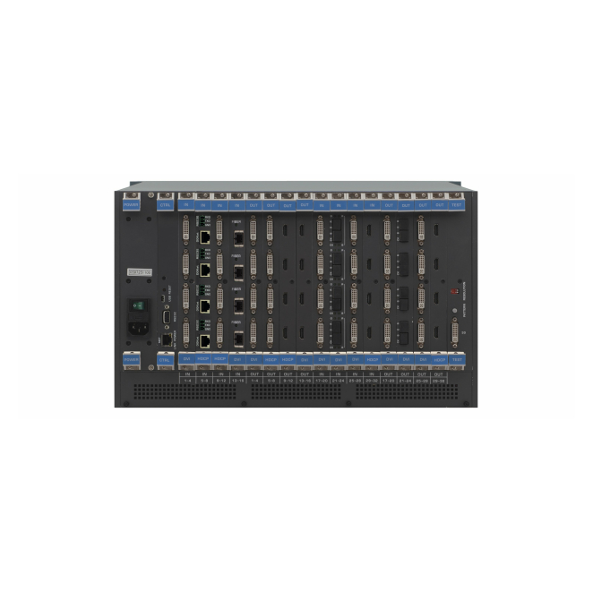 El chasis de red negro Kramer VS-3232DN-EM dispone de 64 puertos, permitiendo una alta conectividad.