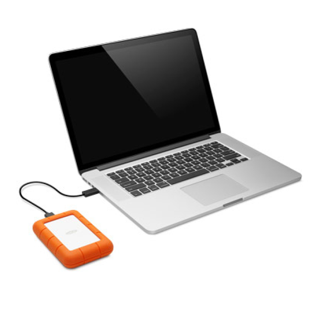 LaCie Rugged Mini disco duro externo de 2 TB con velocidad de 5400 RPM, conexión Micro-USB B 3.2 Gen 1, en colores naranja y plata. SKU: 9000298