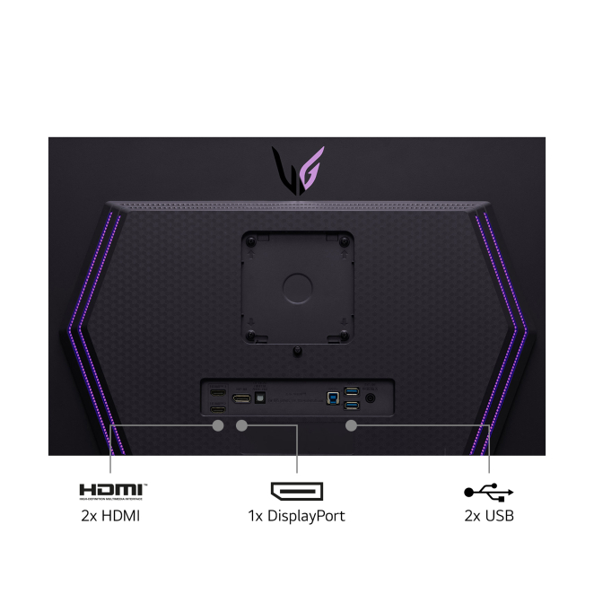 Incluye 2 puertos HDMI 2.1, 1 DisplayPort, 2 puertos USB tipo A descendentes, 1 puerto USB Tipo-B ascendente, y una salida para auriculares.
