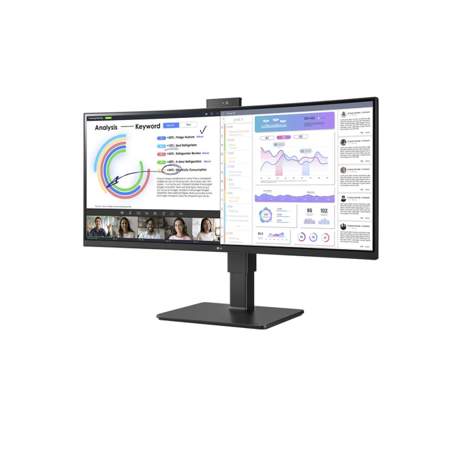 A continuación respondemos algunas de las preguntas más frecuentes sobre el monitor LG 34BQ77QC-B: Sí, gracias a su tiempo de respuesta de 5 ms y la tecnología Flicker-Free, este monitor es excelente para videojuegos, proporcionando una experiencia visual fluida y cómoda. Sí, el monitor LG 34BQ77QC-B incluye dos altavoces incorporados, ofreciendo una calidad de sonido decente para uso general. Sí, este modelo dispone de ajuste de altura, permitiendo configurarlo a la medida de tus necesidades ergonómicas. Sí, el monitor cuenta con un puerto USB Tipo C, lo cual facilita la conexión y carga de dispositivos compatibles. Sí, es compatible con montaje VESA, permitiendo una instalación flexible y práctica en la pared o en soportes específicos. Diagonal de la pantalla 34 " Resolución de la pantalla 3440 x 1440 Pixeles Tipo HD UltraWide Dual Quad HD Relación de aspecto nativa 21:9 Tecnología de visualización LCD Tipo de pantalla IPS Pantalla táctil No Brillo de la pantalla (típico) 300 cd / m² Tiempo de respuesta 5 ms Forma de la pantalla Curva Clasificación de curvatura de la pantalla 3800R Razón de contraste (típica) 1000:1 Máxima velocidad de actualización 60 Hz Ángulo de visión, horizontal 178 ° Ángulo de visión, vertical 178 ° Número de colores de la pantalla 1,07 billones de colores Tamaño de pixel 0,233 x 0,233 mm Alto Rango Dinámico (HDR) Sí Tecnología HDR (High Dynamic Range, Alto rango dinámico) HDR Effect, High Dynamic Range 10 (HDR10) Gama de colores estándar sRGB Gama de colores 90 % Cobertura sRGB (típica) 99 % NVIDIA G-SYNC No AMD FreeSync No Tecnología Flicker free (reduce el parpadeo de la pantalla) Sí Número de altavoces 2 Potencia estimada RMS 10 W Altavoces incorporados Sí Cámara incorporada Sí Posicionamiento de mercado Negocios Color del producto Negro Conector USB incorporado Sí Tipo de puerto USB de carga USB Tipo B Número de puertos ascendentes USB Tipo C 1 Número de puertos ascendentes 2 Número de puertos ascendentes USB Tipo B 1 Cantidad de puertos USB descendentes de tipo A 4 USB Type-C DisplayPort Alternate Mode Sí Suministro de potencia USB Sí Entrega de energía USB (USB Power Delivery) de hasta 90 W HDMI Sí Número de puertos HDMI 2 Salida de auriculares Sí Micrófono, jack de entrada Sí Built-in conmutador KVM Sí Ethernet Sí montaje VESA Sí Interfaz de panel de montaje 100 x 100 mm Montaje de pared Sí Ranura para cable de seguridad No Ajustes de altura Sí Giratorio Sí Ajuste de la inclinación Sí Exhibición en pantalla (OSD) Sí Clase de eficiencia energética (SDR) G Clase de eficiencia energética (HDR) G Consumo de energía (SDR) por 1000 horas 32 kWh Consumo energético 60 W Consumo de energía (inactivo) 0.5 W Consumo de energía (max) 150 W Consumo de energía (apagado) 0.3 W Consumo de energía (HDR) por 1000 horas 51 kWh Voltaje de entrada AC 100 - 240 V Frecuencia de entrada AC 50/60 Hz Tipo de fuente de alimentación Interno Escala de eficiencia energética De la A a la G Código EPREL (Registro europeo de productos para el etiquetado energético) 1299747 Ancho del dispositivo (con soporte) 816.7 mm Profundidad dispositivo (con soporte) 252.9 mm Altura del dispositivo (con soporte) 617.6 mm Peso (con soporte) 10200 g Ancho (sin base) 816.7 mm Profundidad (sin base) 83.6 mm Altura (sin base) 364.4 mm Peso (sin base) 6800 g Ancho del paquete 988 mm Profundidad del paquete 212 mm Altura del paquete 571 mm Peso del paquete 13200 g Tipo de embalaje Caja Stand incluido Sí Tecnologías específicas Crosshair, Super+ Resolution Periodo de garantía 3 año(s)