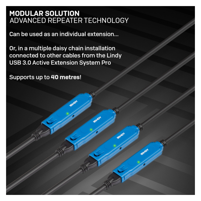 Cable USB 3.2 Gen 1 de 15 metros en color negro, modelo Lindy 43229. SKU: 43229