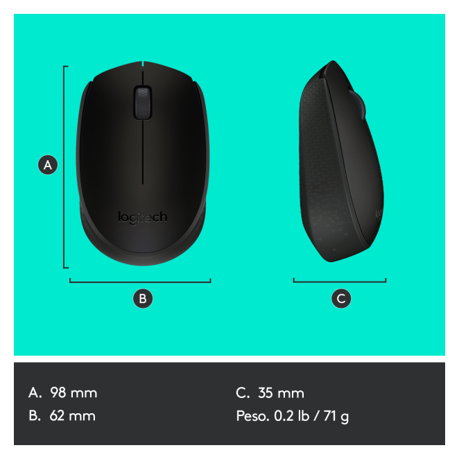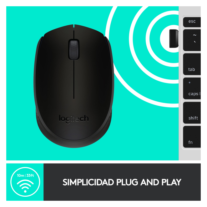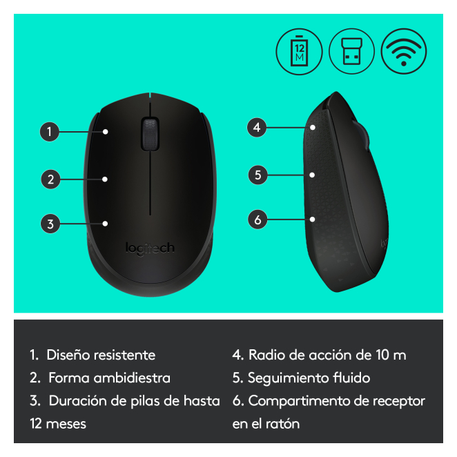 Aquí respondemos algunas de las preguntas más comunes sobre el Logitech M170 ratón inalámbrico. El Logitech M170 ofrece un alcance inalámbrico de hasta 10 metros, permitiendo libertad de movimiento sin interrupciones. Sí, el Logitech M170 es extremadamente fácil de instalar gracias a su funcionalidad Plug and Play, sin necesidad de software adicional. La batería del Logitech M170 puede durar hasta 12 meses con uso regular, utilizando una sola pila AA. Sí, el Logitech M170 es compatible con sistemas operativos Mac, así como con Windows y Chrome. Sí, el diseño ambidextro del Logitech M170 lo hace adecuado tanto para usuarios diestros como zurdos. Utilizar con Oficina Interfaz del dispositivo RF inalámbrico Tecnología de detección de movimientos Óptico Resolución de movimiento 1000 DPI Tipo de botones Botones presionados Tipo de desplazamiento Rueda Cantidad de botones 2 Rueda de desplazamiento Sí Uso recomendado PC/ordenador portátil Frecuencia de banda 2.4 GHz Factor de forma Ambidextro Color del producto Negro Coloración de superficie Monocromo Alcance inalámbrico 10 m Conectar y usar (Plug and Play) Sí Fuente de energía Baterías Numero de baterías soportadas 1 Tipo de batería AA Vida de batería en servicio 12 mes(es) Tecnología de batería Alcalino Puerto de carga USB tipo C No Suministro de potencia USB No Sistema operativo Windows soportado Windows 10, Windows 11, Windows 7, Windows 8 Sistema operativo MAC soportado Mac OS X 10.8 Mountain Lion Sistema operativo Linux soportado Si Otros sistemas operativos soportados ChromeOS Ancho 61.5 mm Peso 70.5 g Profundidad 97.7 mm Altura 35.2 mm Ancho de receptor 14.4 mm Fondo del receptor 6.6 mm Altura de receptor 18.7 mm Peso del receptor 2 g Cantidad por paquete 1 pieza(s) Ancho del paquete 82 mm Profundidad del paquete 125 mm Altura del paquete 200 mm Peso del paquete 124.4 g Receptor incluido Sí Interfaz de receptor inalámbrico USB tipo A Tipo de receptor Nanorreceptor Pilas incluidas Sí Adaptador AC incluido No Código de Sistema de Armomización (SA) 84716070 Ancho de la caja principal 101 mm Longitud de la caja 362 mm Alto de la caja principal 259 mm Peso del envase completo 1400 g
