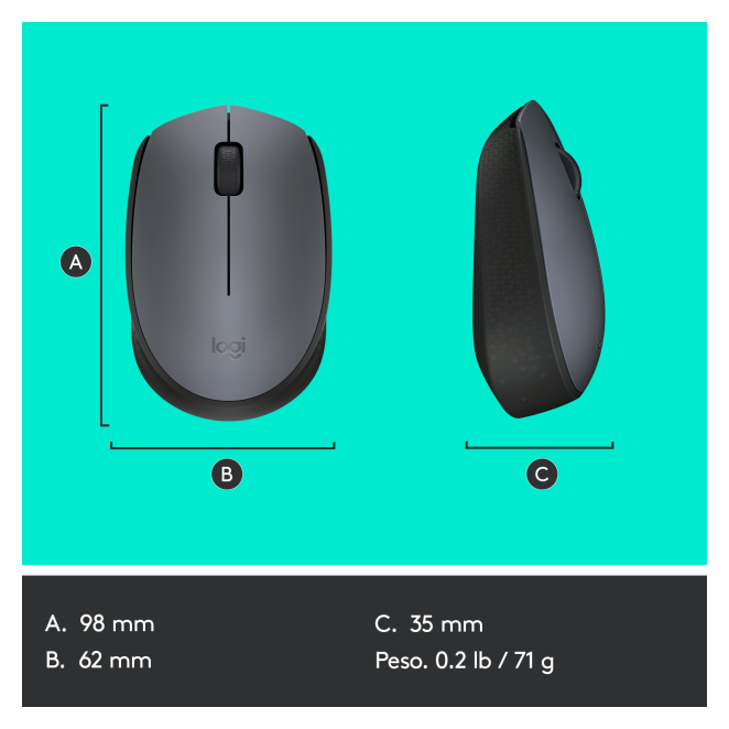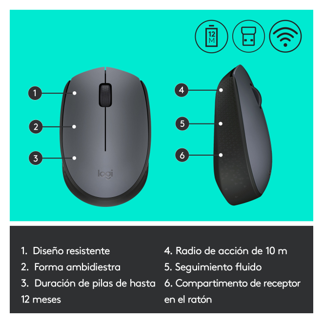 El Logitech M170 se conecta a tu ordenador mediante un nanorreceptor USB tipo A incluido.