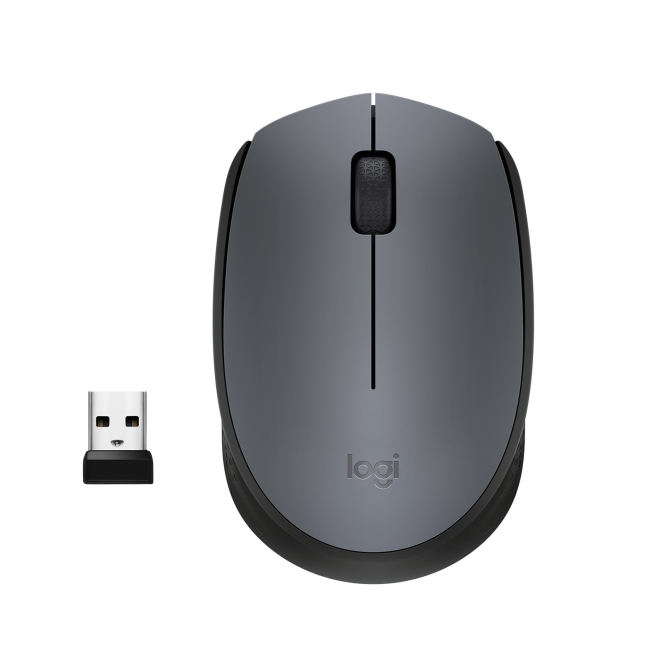 Imagen del ratón Logitech M170 en gris, diseño ambidextro, RF inalámbrico, óptico, con 1000 DPI. SKU 910-004642