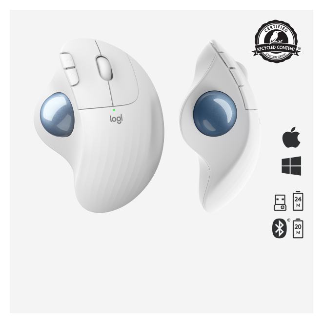 A continuación, se presentan algunas preguntas frecuentes sobre el Logitech ERGO M575 que pueden ayudarte en tu decisión de compra: El Logitech ERGO M575 puede conectarse mediante RF Wireless (utilizando el nanorreceptor USB incluido) o Bluetooth. No, el Logitech ERGO M575 utiliza una batería AA alcalina no recargable, que puede durar hasta 24 meses. Sí, el Logitech ERGO M575 es compatible con sistemas operativos Windows y Mac. Puedes extraer la bola del Logitech ERGO M575 y limpiarla con un paño suave y seco para mantener su funcionamiento óptimo. Sí, el Logitech ERGO M575 permite la programación de sus botones adicionales mediante el software Logitech Options. Sí, el Logitech ERGO M575 cuenta con una garantía limitada de hardware, usualmente de 1 año. Utilizar con Oficina Interfaz del dispositivo RF Wireless + Bluetooth Tecnología de detección de movimientos Trackball Resolución de movimiento 2000 DPI Tipo de botones Botones presionados Tipo de desplazamiento Rueda Botones de ratón programables Sí Cantidad de botones 5 Número de botones programables 3 Frecuencia de banda 2.4 GHz Versión de Bluetooth 5.0 Factor de forma mano derecha Diseño de plancha ergonómico Sí Color del producto Blanco Coloración de superficie Monocromo Alcance inalámbrico 10 m Fuente de energía Baterías Numero de baterías soportadas 1 Tipo de batería AA Vida de batería en servicio 24 mes(es) Tecnología de batería Alcalino Sistema operativo Windows soportado Windows 10, Windows 11, Windows 8 Sistema operativo MAC soportado Mac OS X 10.13 High Sierra Sistema operativo Linux soportado Si Sistemas operativos móviles soportados iPadOS Certificados de sostenibilidad SCS Recycled Content Certification Ancho 100 mm Peso 145 g Profundidad 134 mm Altura 48 mm Ancho de receptor 18.7 mm Fondo del receptor 6.1 mm Altura de receptor 14.4 mm Peso del receptor 1.8 g Cantidad por paquete 1 pieza(s) Ancho del paquete 51 mm Profundidad del paquete 106.5 mm Altura del paquete 160 mm Peso del paquete 243.7 g Receptor incluido Sí Interfaz de receptor inalámbrico USB tipo A Tipo de receptor Nanorreceptor Pilas incluidas Sí Código de Sistema de Armomización (SA) 84716070 Ancho de la caja principal 220 mm Longitud de la caja 262 mm Alto de la caja principal 173 mm Peso del envase completo 2697 g