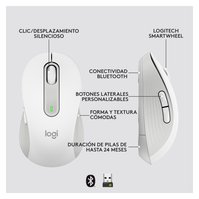 Ratón inalámbrico Logitech Signature M650 para negocios, blanco, adecuado para manos pequeñas o medianas, con conectividad Logi Bolt y Bluetooth, incluye la tecnología SmartWheel. SKU 910-006275.