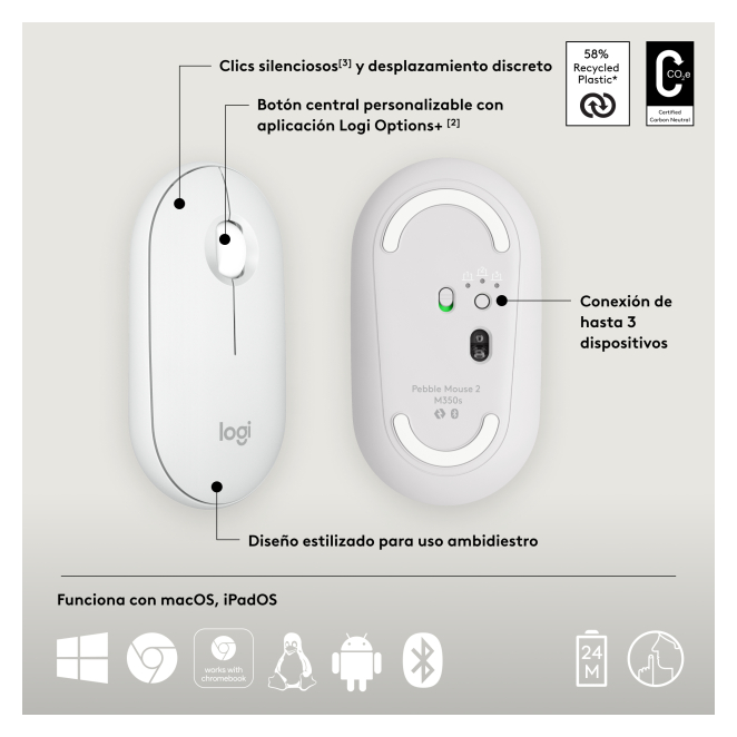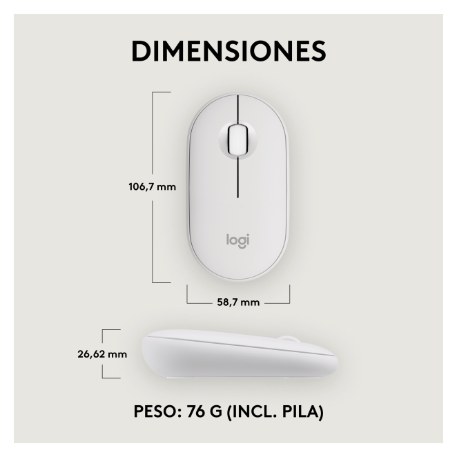 Aquí respondemos algunas de las preguntas más comunes sobre el Logitech 910-007013 ratón. Sí, el ratón inalámbrico Logitech es compatible con ambos sistemas operativos. Easy-Switch permite cambiar entre tres dispositivos distintos con solo presionar un botón en el ratón. Utiliza una batería AA, la cual está incluida en el paquete. Sí, este ratón cuenta con tecnología de clic silencioso para una experiencia de uso más placentera. La batería puede durar hasta 24 meses, dependiendo del uso. Aunque es preciso con sus 4000 DPI, está diseñado principalmente para trabajos diarios y viajes, no tanto para juegos. Utilizar con Viajes Interfaz del dispositivo RF Wireless + Bluetooth Tecnología de detección de movimientos Óptico Resolución de movimiento 4000 DPI Tipo de botones Botones presionados Tipo de desplazamiento Rueda Cantidad de botones 3 Factor de forma Ambidextro Color del producto Blanco Coloración de superficie Monocromo Alcance inalámbrico 10 m Fuente de energía Baterías Numero de baterías soportadas 1 Tipo de batería AA Vida de batería en servicio 24 mes(es) Tecnología de batería Alcalino Sistema operativo Windows soportado Windows 10, Windows 11 Sistema operativo MAC soportado Mac OS X 11.0 Big Sur, Mac OS X 12.0 Monterey, Mac OS X 13.0 Ventura Sistema operativo Linux soportado Si Sistemas operativos móviles soportados Android 10.0, Android 11.0, Android 12.0, Android 13.0, Android 9.0, iPadOS Otros sistemas operativos soportados ChromeOS Certificados de sostenibilidad CarbonNeutral, Forest Stewardship Council (FSC) Ancho 58.7 mm Peso 76 g Profundidad 106.7 mm Altura 26.62 mm Cantidad por paquete 1 pieza(s) Pilas incluidas Sí Manual de usuario Sí