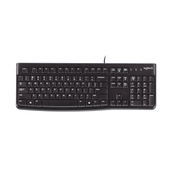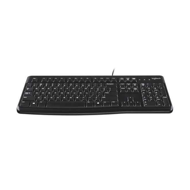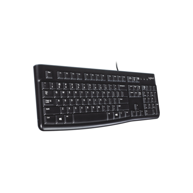 Imagen del teclado Logitech K120 para negocios, modelo universal con conexión USB, diseño QWERTY en inglés y color negro. SKU: 920-002524