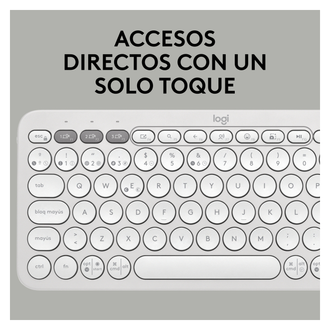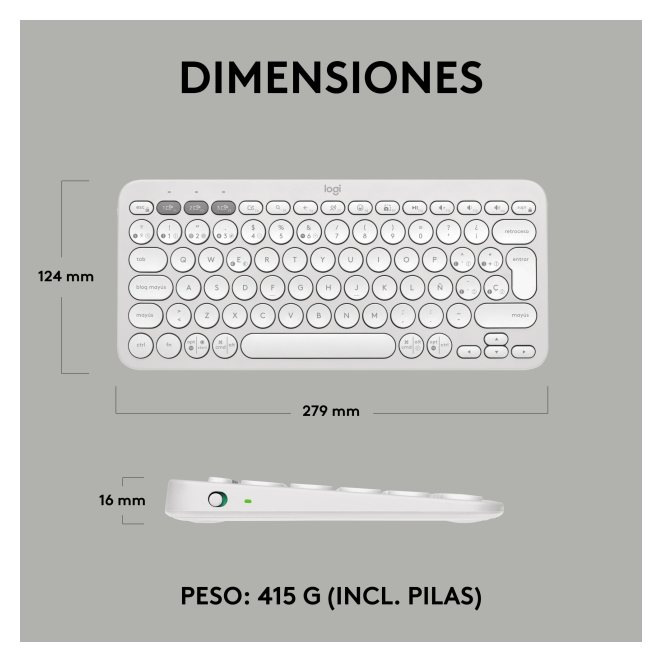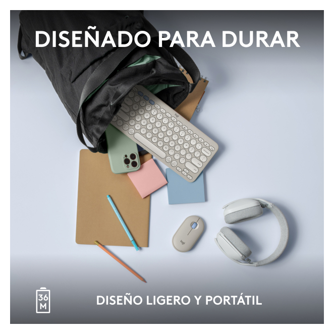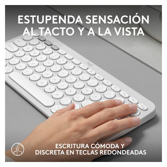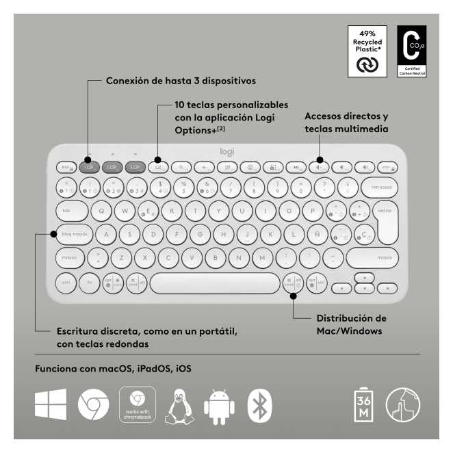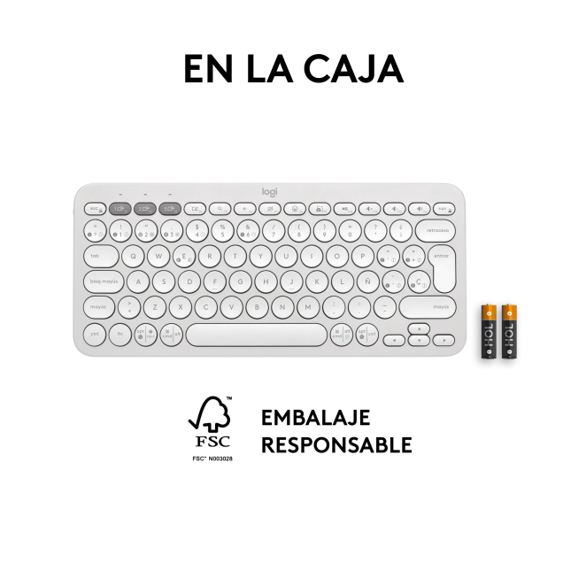 A continuación, respondemos a algunas de las preguntas más habituales sobre el Logitech Pebble Keys 2 K380s. Sí, el Logitech Pebble Keys 2 K380s es compatible con dispositivos Android e iOS, permitiéndote cambiar entre ellos fácilmente gracias a su función Easy-Switch. Puedes emparejar hasta tres dispositivos con el Logitech Pebble Keys 2 K380s y cambiar entre ellos con solo presionar uno de los botones Easy-Switch. La batería del Logitech Pebble Keys 2 K380s tiene una duración aproximada de hasta 36 meses, dependiendo del uso y las condiciones de uso. No, el Logitech Pebble Keys 2 K380s no incluye retroiluminación, pero su diseño de teclas lisas y su ergonomía facilitan su uso en diferentes condiciones de iluminación. Sí, se incluyen dos pilas AAA para el funcionamiento del Logitech Pebble Keys 2 K380s. Uso recomendado Universal Tecnología de conectividad Inalámbrico Interfaz del dispositivo Bluetooth Interruptor del teclado Switch de tecla de tijera Diseño de teclado QWERTY Idioma del teclado Español Dispositivo apuntador No Formato del teclado Mini Teclado numérico No Teclas de acceso directo Sí Interruptor de encendido/apagado integrado Sí Retroiluminación No Estilo de teclado Derecho Color del producto Blanco Coloración de superficie Monocromo Indicadores LED Si Alcance inalámbrico 10 m Alimentación Batería Teclado tipo de batería AAA Número de pilas (teclado) 2 Tecnología de batería Alcalino Vida de batería en servicio 36 mes(es) Ratón incluido No Sistema operativo Windows soportado Windows 10, Windows 11 Sistema operativo Linux soportado Si Otros sistemas operativos soportados ChromeOS Sistemas operativos móviles soportados Android 10.0, Android 11.0, Android 12.0, Android 13.0, Android 8.0, iOS 14, iOS 14.5, iOS 15, iOS 16, iPadOS Dimensiones de teclado (Ancho x Profundidad x Altura) 279 x 16 x 124 mm Peso del teclado 415 g Número de productos incluidos 1 pieza(s) Receptor incluido No Pilas incluidas Sí