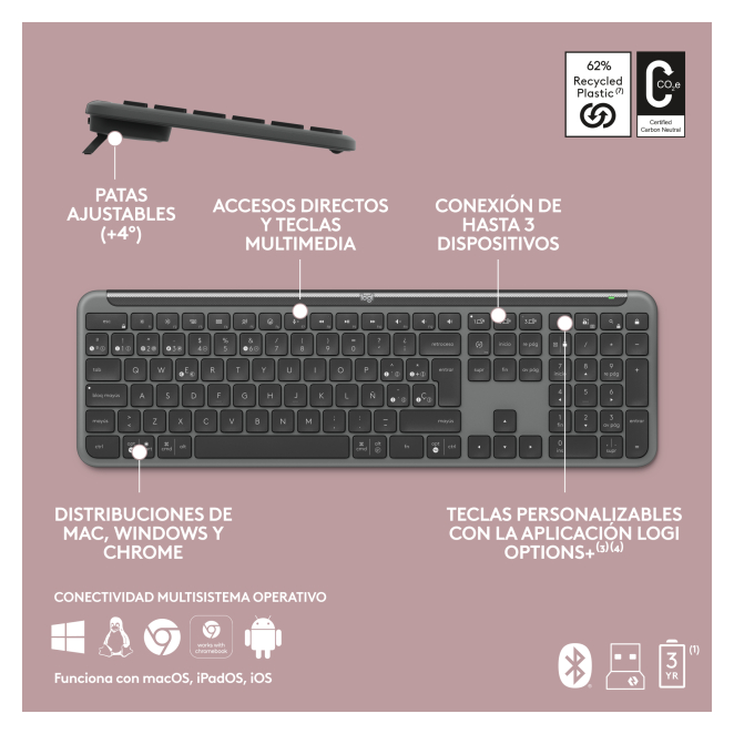 Versatilidad: Con su conectividad dual (RF Wireless y Bluetooth), el teclado se conecta fácilmente a múltiples dispositivos, haciéndolo una excelente opción como teclado para oficina.