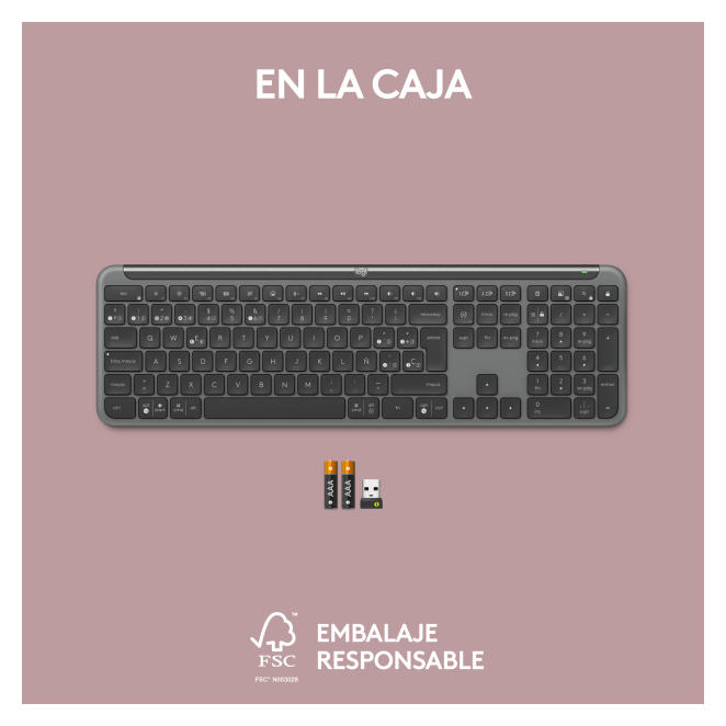 El paquete incluye el Logitech Signature Slim K950, dos pilas AAA, un nanorreceptor USB tipo A, un manual de usuario, y una tarjeta de garantía con un período de dos años.
