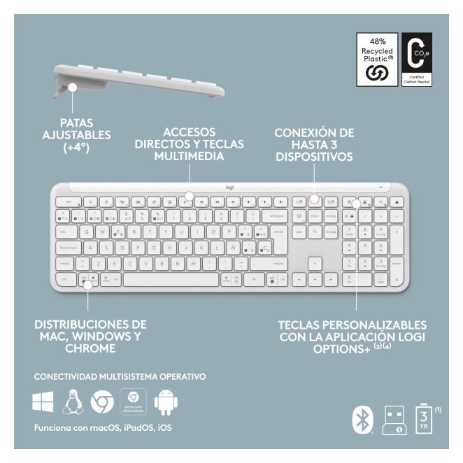 - Batería de Larga Duración: Disfruta de hasta 36 meses de uso del teclado y 24 meses del ratón sin necesidad de recargar.