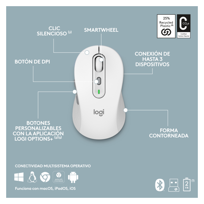 El ratón tiene una duración de batería de hasta 24 meses con un uso regular, gracias a su tecnología de batería alcalina.