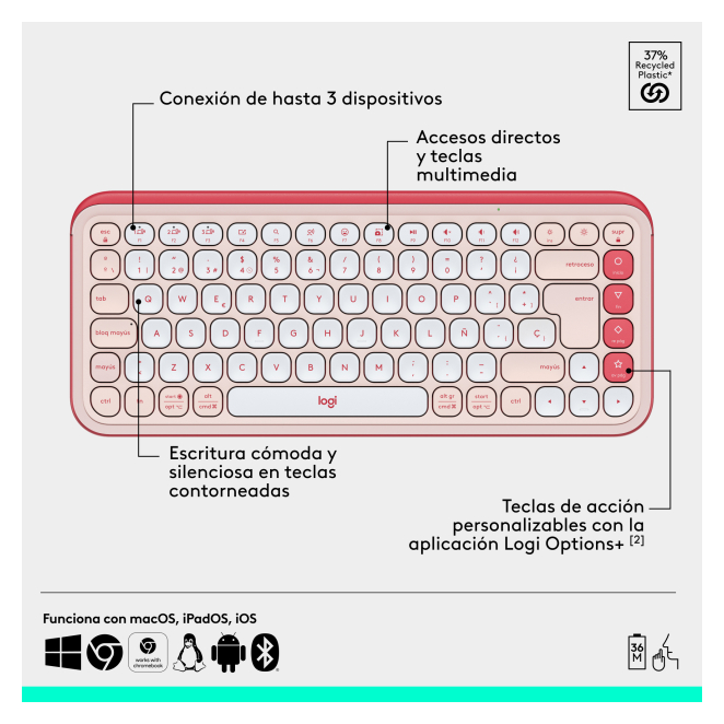 El Logitech POP ICON COMBO proporciona varias ventajas que lo hacen ideal para todo tipo de usuarios. Sus teclas de perfil bajo garantizan una escritura rápida y cómoda, ideal para largos periodos de uso. Los clics del ratón son discretos, permitiendo trabajar en entornos silenciosos sin molestias. Además, el Logitech POP ICON COMBO se puede conectar a tres dispositivos de manera simultánea, facilitando la transición entre tareas. Este combo cuenta con materiales reciclados, alineándose con una opción más sostenible y eco-amigable.