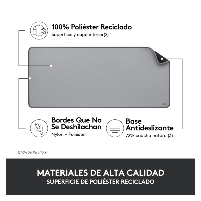 La Logitech Desk Mat es la elección ideal para quienes buscan calidad y funcionalidad. Alta durabilidad: Fabricada con nylon, poliéster y caucho, la Logitech Desk Mat es extremadamente robusta y resistente. Base antiderrapante: Asegura que la alfombrilla se mantenga en su lugar, incluso durante movimientos bruscos. Ecológicamente responsable: Con un 16% de materiales reciclados en su fabricación, contribuyes a un planeta más verde. Atractivo diseño: Su color gris monocromo y bordes rematados dan un toque elegante y profesional a cualquier escritorio.