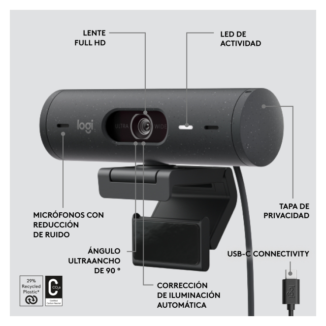 La Logitech Brio 500 ofrece una resolución máxima de 1920 x 1080 y una velocidad de cuadro de 60 fps, asegurando una calidad de video de primera. Sí, la Logitech Brio 500 cuenta con tecnología de autoenfoque y corrección automática de luz, lo que garantiza que siempre te veas lo mejor posible en cualquier condición de iluminación. Absolutamente, la Logitech Brio 500 es ideal para streaming gracias a su alta resolución, velocidad de cuadro y características avanzadas como el zoom digital de 4x y la cancelación de ruido. La tapa de obturador proporciona privacidad instantánea, lo que es crucial para aquellos que desean asegurarse de que no están siendo grabados cuando no están usando la webcam. La Logitech Brio 500 se conecta fácilmente a través de un puerto USB y cuenta con tecnología Plug and Play, haciendo que su instalación sea sencilla y sin complicaciones. Megapixeles 4 MP Máxima resolución de video 1920 x 1080 Pixeles Velocidad máxima de cuadro 60 pps Tipo de cámara HD Full HD Capacidad de zoom Sí Resolución en velocidad de captura 1280x720@60fps, 1920x1080@30fps Corrección automática de la luz Sí Formato de vídeo soportado 1080p, 720p Autoenfoque Sí Zoom digital 4 x Cámara con configuración de privacidad Sí Tipo de privacidad Tapa de obturador Rastreo de rostros Sí Balance de blancos Auto Diagonal de campo de visión 90 ° Campo de visión regulable Sí Número de modos de campo de visión 3 Conectar y usar (Plug and Play) Sí Interfaz USB Color del producto Grafito Tipo de montaje Recortar Material de la lente Vidrio Flash integrado No USB con suministro de corriente Sí Longitud de cable 1.5 m Indicadores LED Si Sistema operativo Windows soportado Si Sistema operativo MAC soportado MacOS Otros sistemas operativos soportados ChromeOS RAM mínima 2000 MB Conexión a Internet Sí Micrófono incorporado Sí número de micrófonos 2 Micrófono gama de pick-up 1.22 m Certificados de sostenibilidad Forest Stewardship Council (FSC) Ancho 110 mm Peso 121 g Peso (con soporte) 121 g Profundidad 31.5 mm Altura 31.5 mm Dimensiones del clip de montaje acoplable (An x L x Al) 45,8 x 65,1 x 25 mm Cantidad 1 Ancho del paquete 56.5 mm Profundidad del paquete 130 mm Altura del paquete 84.5 mm Peso del paquete 197 g Cables incluidos USB Type C Abrazadera para LCD Sí Ancho de la caja principal 180 mm Longitud de la caja 270 mm Alto de la caja principal 130 mm Peso del envase completo 1800 g