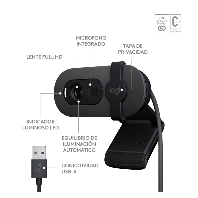 La cámara web Logitech Brio 100 tiene un cable USB de 1.5 metros, lo cual facilita su instalación en tu escritorio.