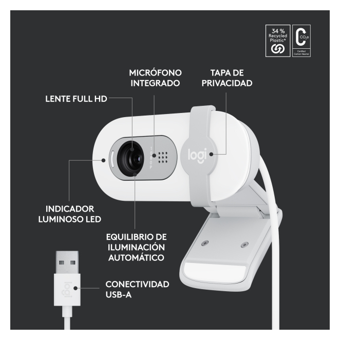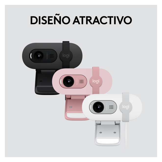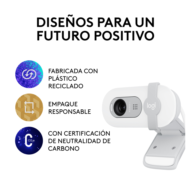 Aquí respondemos algunas de las preguntas más comunes sobre la Logitech Brio 100 para ayudarte a tomar la mejor decisión de compra. Sí, la Logitech Brio 100 es compatible con la mayoría de los sistemas operativos actuales como Windows, macOS y Linux. No, la Logitech Brio 100 no necesita software adicional. Se conecta a través de USB y se configura automáticamente. Sí, la Logitech Brio 100 es ideal para streaming en plataformas como Twitch y YouTube, ofreciendo calidad de video en Full HD y un excelente audio. No, la Logitech Brio 100 cuenta con enfoque fijo, garantizando estabilidad y claridad en las videollamadas. Sí, la Logitech Brio 100 incluye una tapa de privacidad que se puede utilizar para cubrir la lente cuando la cámara no está en uso. Megapixeles 2 MP Máxima resolución de video 1920 x 1080 Pixeles Velocidad máxima de cuadro 30 pps Tipo de cámara HD Full HD Resolución en velocidad de captura 1280x720@30fps, 1920x1080@30fps Formato de vídeo soportado 1080p, 720p Cámara con configuración de privacidad Sí Tipo de privacidad Tapa de privacidad Elementos de objetivos de cámara Lente de 4 elementos Rastreo de rostros No Diagonal de campo de visión 58 ° Enfoque fijo Sí Interfaz USB Color del producto Blanco Tipo de montaje Clip/Soporte Material de la lente Vidrio Flash integrado No Longitud de cable 1.5 m Sistema operativo Windows soportado Si Sistema operativo MAC soportado MacOS Otros sistemas operativos soportados ChromeOS RAM mínima 1000 MB Micrófono incorporado Sí Micrófono gama de pick-up 1 m Tipo de dirección de micrófono Omnidireccional Certificados de sostenibilidad CarbonNeutral, Forest Stewardship Council (FSC) Ancho 72.91 mm Peso 75 g Profundidad 66.64 mm Altura 31.91 mm Cantidad 1 Ancho del paquete 52.6 mm Altura del paquete 78.3 mm Manual de usuario Sí Contenidos de caja Cámara web Documentación del usuario