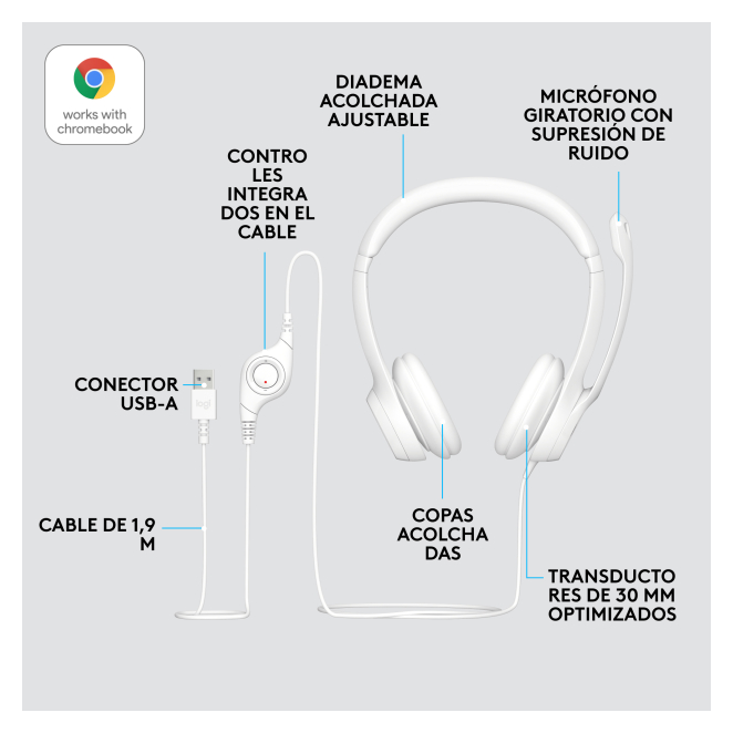 Aquí tienes algunas razones por las que deberías considerar adquirir los auriculares Logitech H390: Los transductores optimizados y el audio digital garantizan una experiencia auditiva superior tanto para llamadas como para el entretenimiento. El micrófono con supresión de ruido asegura que tus conversaciones sean claras y sin distracciones. La tecnología Plug and Play permite una configuración rápida y sencilla. Fácil acceso para ajustar el volumen y silenciar el micrófono sin interrumpir tus actividades. Diseño ergonómico que permite un uso prolongado sin molestias. Aquí tienes algunas preguntas frecuentes sobre los auriculares Logitech H390: Sí, los auriculares Logitech H390 son compatibles con la mayoría de las computadoras que tienen puerto USB tipo A. Absolutamente, los Logitech H390 están diseñados específicamente para ofrecer audio claro en videollamadas y conferencias. Sí, el micrófono de los Logitech H390 es ajustable y se puede plegar cuando no está en uso. Sí, el micrófono de los Logitech H390 cuenta con tecnología de cancelación de ruido para asegurar conversaciones claras. El cable de los auriculares Logitech H390 tiene una longitud de 1.9 metros, proporcionando una gran libertad de movimiento. Tipo de producto Auriculares Estilo de uso Diadema Uso recomendado Oficina/Centro de llamadas Color del producto Blanco Control de volumen Botón Tipo de controles Caja de control en cable Longitud de cable 1.9 m Conectar y usar (Plug and Play) Sí Tecnología de conectividad Alámbrico Conexión USB Sí Conector USB USB tipo A Audifonos Supraaural Frecuencia de auricular 20-20000 Hz Obstrucción 32 Ω Sensibilidad de auricular 94 dB Tipo de micrófono Boom Frecuencia de micrófono 100-10000 Hz Cancelación de ruido del micrófono Sí Sensibilidad de micrófono -17 dB Sistema operativo Windows soportado Si Sistema operativo MAC soportado MacOS Ancho 151 mm Profundidad 68 mm Altura 171 mm Peso 197 g Ancho del paquete 72 mm Profundidad del paquete 174 mm Altura del paquete 193 mm Peso del paquete 260 g Cantidad 1 Manual de usuario Sí Ancho de la caja principal 308 mm Longitud de la caja 379 mm Alto de la caja principal 431 mm Peso del envase completo 5500 g
