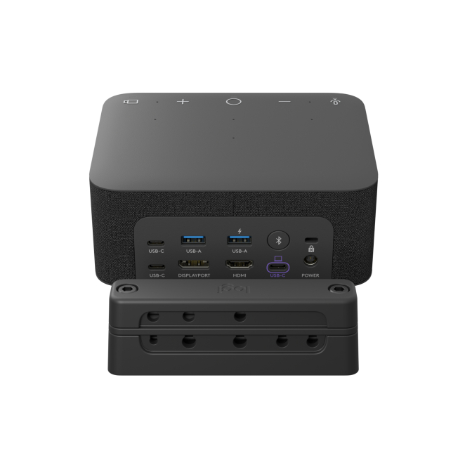 El Logitech Logi Dock Focus Room Kit UC incluye altavoces incorporados y tecnología de audio beamforming para una mejor calidad de sonido.