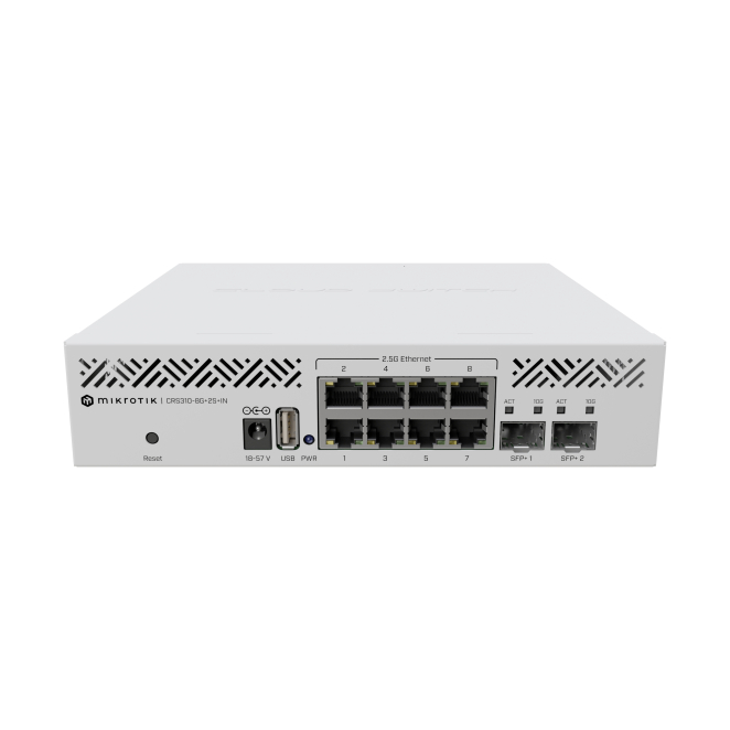 El Mikrotik CRS310-8G+2S+IN cuenta con ocho puertos RJ-45 Ethernet de 2.5G, lo que asegura un alto rendimiento y flexibilidad.