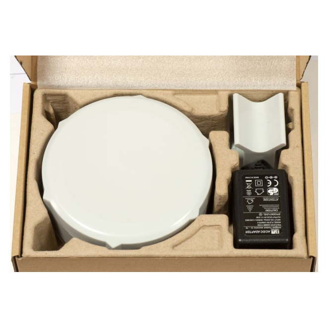 El paquete incluye el dispositivo Mikrotik SXT SA5, un adaptador AC, un kit de montaje y una guía de configuración rápida.