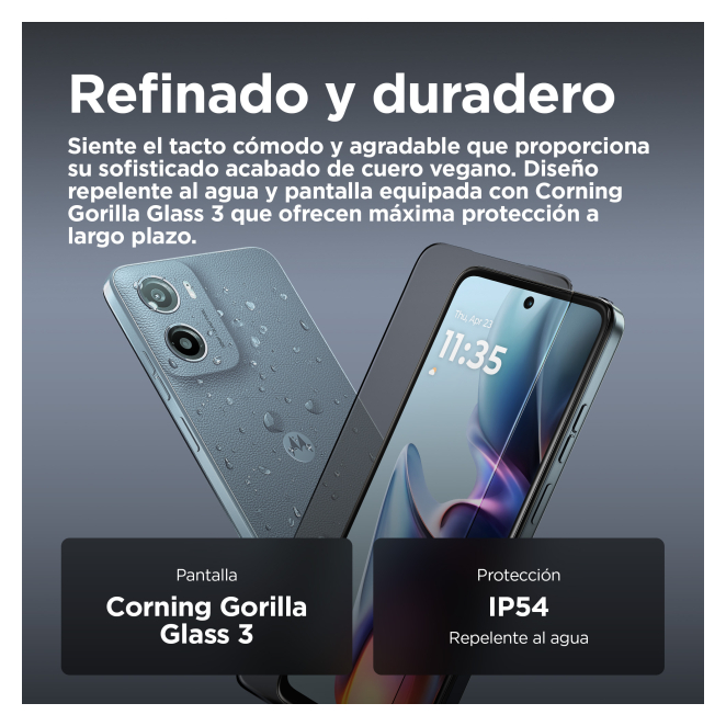 El Motorola moto e15 tiene un diseño resistente a salpicaduras y derrames de agua, garantizando durabilidad ante condiciones adversas.
