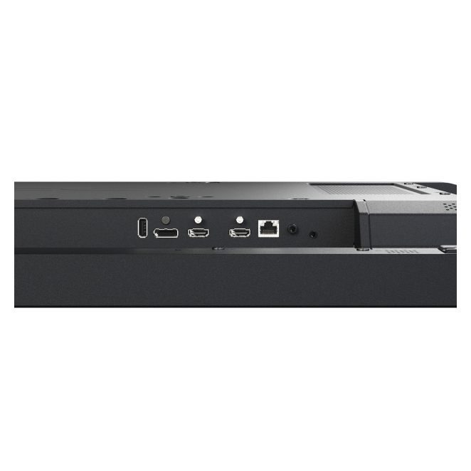 La NEC MultiSync M651 cuenta con 2 puertos HDMI, 1 DisplayPort, 1 puerto Ethernet LAN (RJ-45) y 1 salida de audio (L,R), entre otros.