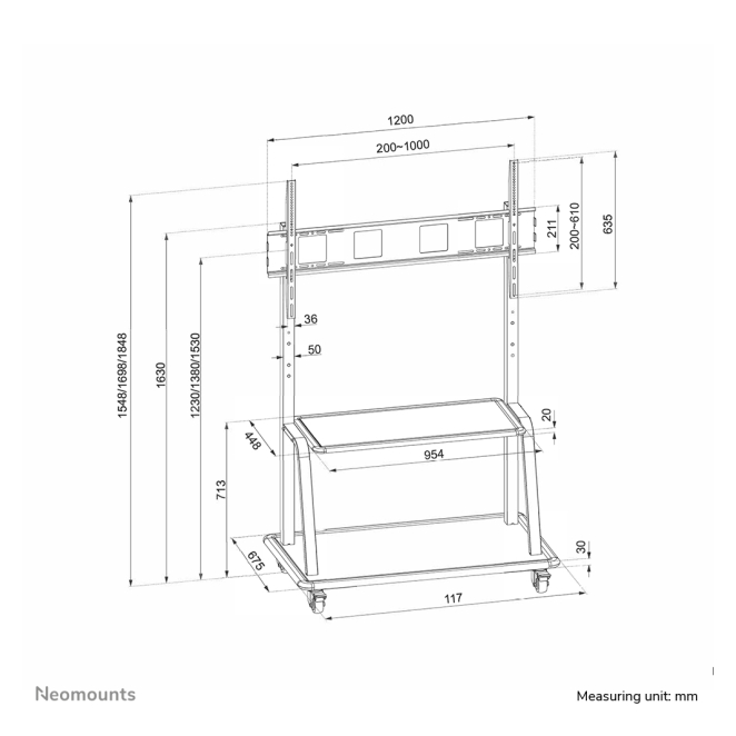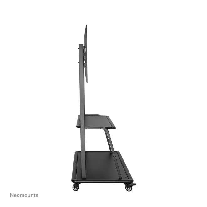 El Neomounts NS-M4000BLACK carro para TV 60-105” ha sido diseñado para ofrecer una experiencia de usuario excepcional. La posibilidad de ajustar la altura manualmente entre 1310 y 1530 mm permite una mayor flexibilidad, asegurando que la pantalla esté a la altura perfecta para cualquier presentación o visualización. Las cuatro ruedas giratorias permiten un movimiento suave y sin esfuerzo, mientras que dos de ellas cuentan con frenos para mantener la unidad estable en el lugar deseado. Este carro, además, incluye un estante adicional para dispositivos electrónicos.