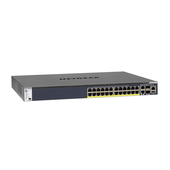 El NETGEAR M4300-28G-PoE+ tiene 24 puertos 10G Ethernet que soportan PoE+, lo que permite alimentar diversos dispositivos conectados.