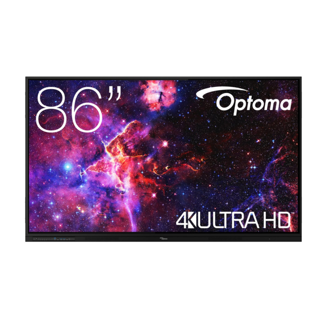 Pizarra blanca interactiva Optoma de 86 pulgadas con resolución 3840 x 2160 píxeles, pantalla táctil y puertos USB. SKU: H1F0H08BW101
