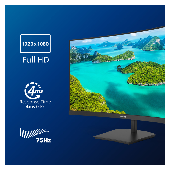 Aquí respondemos algunas preguntas comunes sobre el Philips E Line 241E1SC/00: Sí, el Philips E Line 241E1SC/00 es compatible con montaje VESA, lo cual facilita su instalación. No, este modelo no incluye una entrada para auriculares, pero tiene opciones de conectividad HDMI. Definitivamente, el Philips E Line 241E1SC/00 tiene tecnología AMD FreeSync y un tiempo de respuesta de 4 ms, ideal para juegos. Sí, aunque el monitor cuenta con un puerto HDMI, es posible alternar entre diferentes dispositivos gracias a sus opciones de conectividad. El monitor incorpora tecnologías Low Blue Light y Flicker-free, ambas diseñadas para reducir la fatiga ocular. Diagonal de la pantalla 23.6 " Resolución de la pantalla 1920 x 1080 Pixeles Tipo HD Full HD Relación de aspecto nativa 16:9 Relación de aspecto 16:9 Tecnología de visualización LED Tipo de pantalla VA Tipo de retroiluminación W-LED Pantalla táctil No Brillo de la pantalla (típico) 250 cd / m² Tiempo de respuesta 4 ms Pantalla antirreflectante Sí Forma de la pantalla Curva Clasificación de curvatura de la pantalla 1500R Formatos gráficos soportados 1920 x 1080 (HD 1080) Razón de contraste (típica) 3000:1 Máxima velocidad de actualización 75 Hz Ángulo de visión, horizontal 178 ° Ángulo de visión, vertical 178 ° Número de colores de la pantalla 16,7 millones de colores Tamaño de pixel 0,272 x 0,272 mm Densidad del pixel 93 ppp Intervalo de escaneado horizontal 30-85 kHz Intervalo de escaneado vertical 48-76 Hz Tamaño visible, horizontal 521.4 mm Tamaño visible, vertical 293.3 mm Diagonal de pantalla 59.9 cm DDC / CI Sí Índice de niebla 25 % Dureza de la superficie 3H Frecuencia digital horizontal 30-85 kHz Frecuencia digital vertical 48-76 Hz Gama de colores estándar sRGB Gama de colores 87 % Cobertura sRGB (típica) 100.78 % Cobertura NTSC (típica) 83.87 % AMD FreeSync Sí Tecnología Flicker free (reduce el parpadeo de la pantalla) Sí Tecnología Low Blue Light (baja luz azul) Sí Altavoces incorporados No Cámara incorporada No Posicionamiento de mercado Hogar Color del producto Negro Bisel frontal Negro Soporte desmontable Sí Color de pies Negro Conector USB incorporado No Cantidad de puertos VGA (D-Sub) 1 Puerto DVI No HDMI Sí Número de puertos HDMI 1 Salida de auriculares No Enchufe de entrada de CC Sí montaje VESA Sí Interfaz de panel de montaje 100 x 100 mm Ranura para cable de seguridad Sí Tipo de ranura de bloqueo del cable Kensington Ajustes de altura No Ajuste de la inclinación Sí Ángulo de inclinación -5-20 ° Exhibición en pantalla (OSD) Sí Idiomas OSD Alemán, Checo, Chino simplificado, Chino tradicional, Coreano, Español, Finés, Francés, Griego, Holandés, Húngaro, Inglés, Italiano, Japonés, Polaco, Portugués, Ruso, Sueco, Turco, Ucraniano Número de lenguajes OSD 21 Conectar y usar (Plug and Play) Sí Indicadores LED Operación, Suspension Clase de eficiencia energética (SDR) F Consumo de energía (SDR) por 1000 horas 20 kWh Consumo energético 27.9 W Consumo de energía (inactivo) 0.5 W Consumo de energía (apagado) 0.3 W Voltaje de entrada AC 100 - 240 V Frecuencia de entrada AC 50 - 60 Hz Tipo de fuente de alimentación Externo Código EPREL (Registro europeo de productos para el etiquetado energético) 405280 Intervalo de temperatura operativa 0-40 °C Intervalo de temperatura de almacenaje -20-60 °C Intervalo de humedad relativa para funcionamiento 20-80 % Altitud de funcionamiento 0-3658 m Altitud no operativa 0-12192 m Ancho del dispositivo (con soporte) 536 mm Profundidad dispositivo (con soporte) 202 mm Altura del dispositivo (con soporte) 413 mm Peso (con soporte) 3140 g Ancho (sin base) 536 mm Profundidad (sin base) 66 mm Altura (sin base) 322 mm Peso (sin base) 2460 g Ancho del paquete 595 mm Profundidad del paquete 154 mm Altura del paquete 475 mm Peso del paquete 4970 g Tipo de embalaje Caja Stand incluido Sí Cables incluidos Corriente alterna, HDMI No contiene Mercurio, PVC/BFR Libre de metales pesados Hg (mercurio), Pb (plomo) Certificados de conformidad RoHS Tipo de acabado exterior Con relieve Certificación CB, CE Mark, CU-EAC, EAEU RoHS, TUV/ISO9241-307, TUV-BAUART