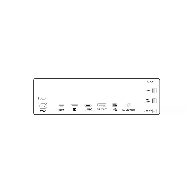 El monitor cuenta con un conector USB-C, cuatro puertos USB Tipo-A descendentes y un puerto Ethernet, proporcionando variadas opciones de conectividad.