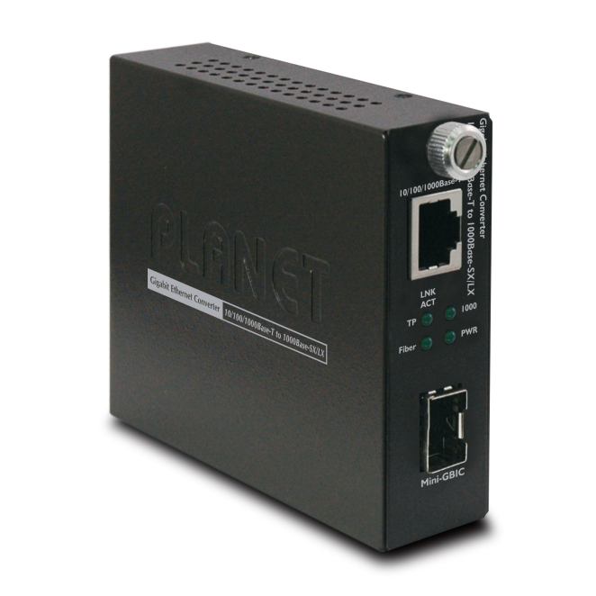 Convertidor de medio PLANET GST-805A con velocidad de 2000 Mbit/s en color negro y diseño compacto. SKU: GST-805A