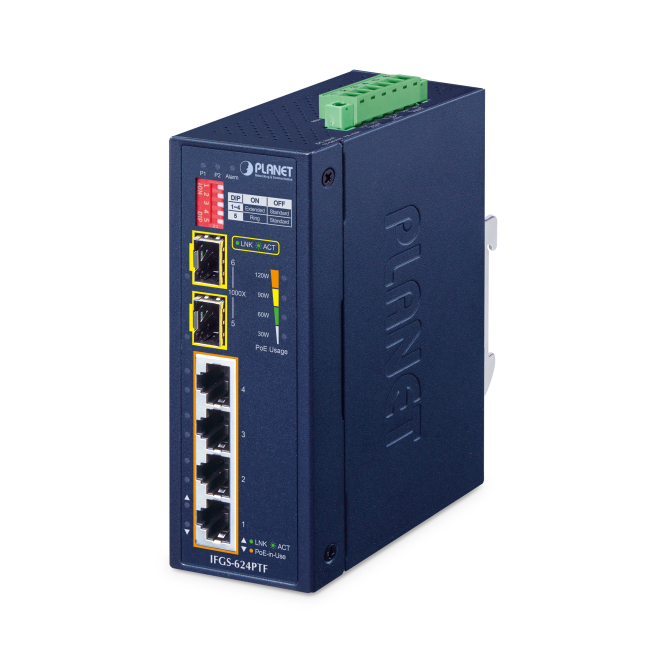 Switch Fast Ethernet no administrado PLANET con tecnología PoE y color azul, SKU IFGS-624PTF