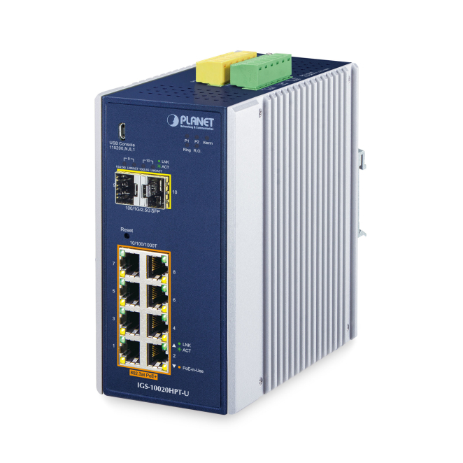 El PLANET DIN-Rail L2+/L3 Manageable incluye 8 puertos básicos de conmutación RJ-45 Ethernet Gigabit (10/100/1000).