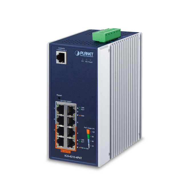 Imagen del switch gestionado PLANET IGS-4215-4P4T L2/L4 Gigabit Ethernet con PoE, colores azul y blanco.