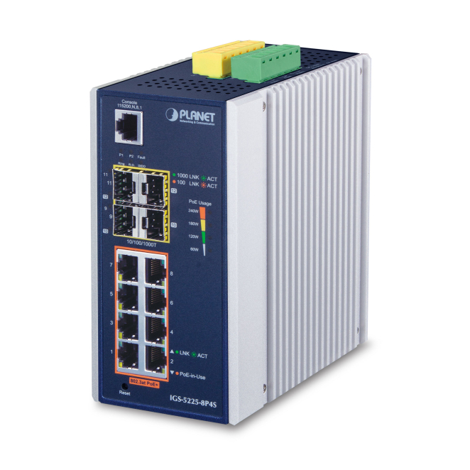 El PLANET IGS-5225-8P4S es un switch gestionado L2+ Gigabit Ethernet con 8 puertos RJ-45 y soporte para energía sobre Ethernet (PoE).