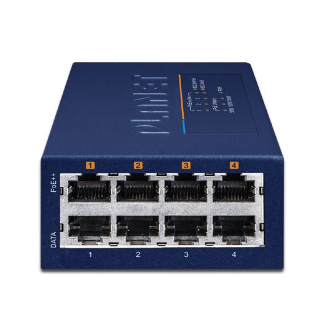 Vista frontal del switch Fast Ethernet PLANET UPOE-400 con soporte PoE en color azul (UPOE-400)