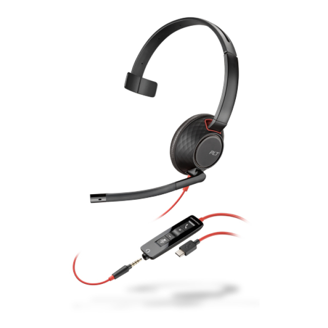 Auriculares alámbricos Poly Blackwire 5210 de diadema en negro y rojo, ideales para llamadas y música con conexión USB Tipo C, SKU 207587-03.